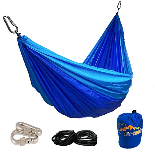 OUT-Cores XXL Hängematte mit Befestigungsset | für Camping, Trekking, Wandern, Reisen | 300*150 cm | 2 Karabiner | 2 Befestigungsseilen | 100% Zufriedenheitsgarantie | Ultraleicht | Reisen | | 2 Personen | bis 200 kg | Wetterfest